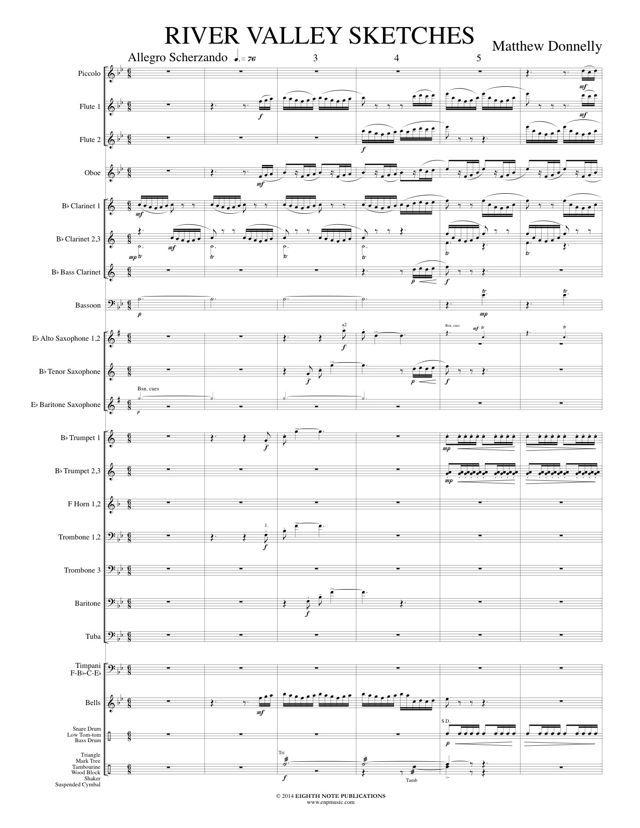 River Valley Sketches was written as a short musical depiction of the composer s hometown and the river that runs through it. The inspiration for some of the melodic and rhythmic material comes from the Scottish River Nith and has that great Scottish flare to it. Well scored and clever writing allow for the band members to contribute interesting lines and musical ideas. |