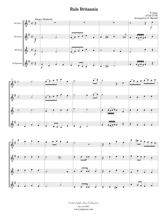 Always a popular British tune with some interesting flourishes, Rule Britannia is an ideal piece for a mid high school level saxophone quartet. It would work well as an encore or as a lighter piece between two heavier, contemporary works.