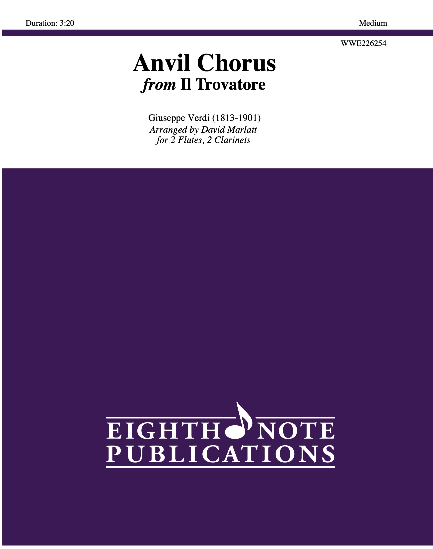The rousing and well-known Anvil Chorus or Gyspy Chorus from Verdi's Il Trovatore (The Troubadour) depicts Spanish gypsies striking their anvils at dawn and singing the praises of hard work, good wine, and their gypsy women. This is a flashy piece and everyone gets a good part. |