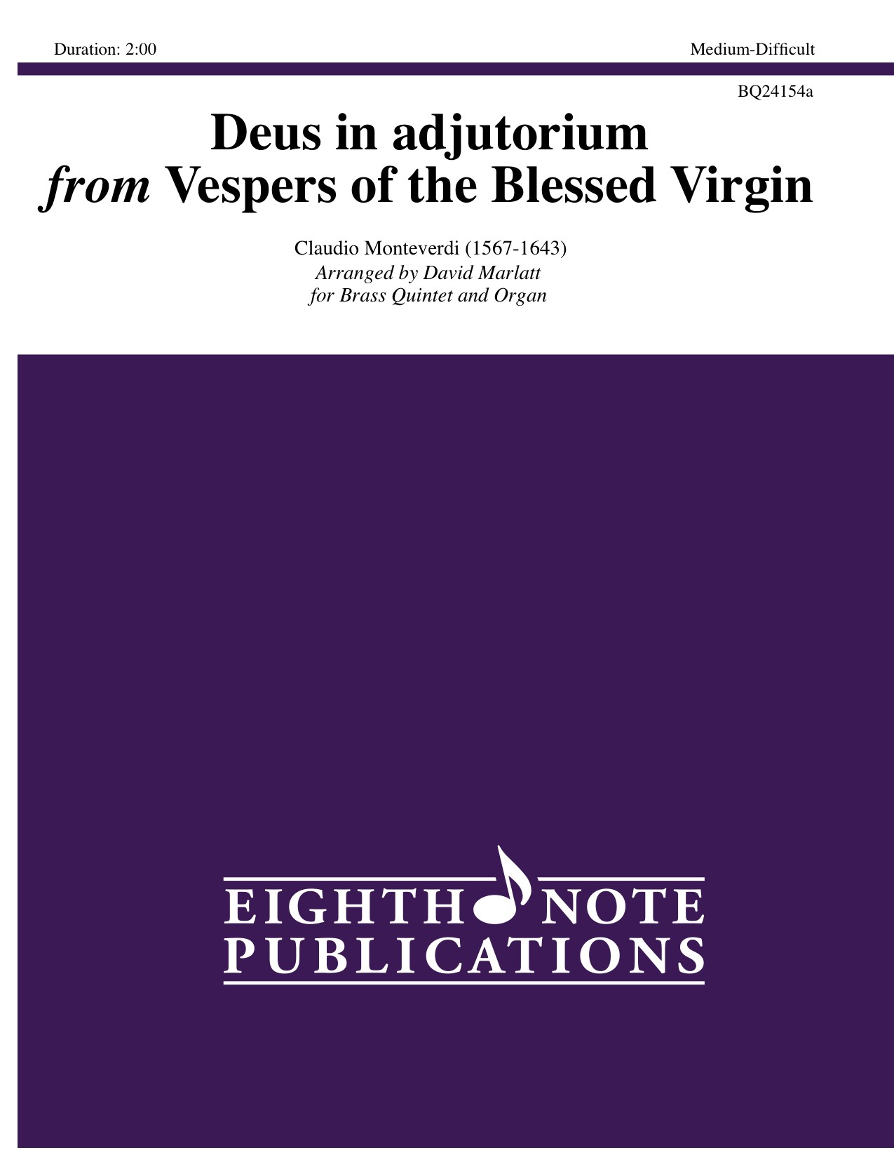 Originally written for orchestra and a large choir, this powerful work was to be performed in a large church in Venice, perhaps even Saint Mark's Cathedral. One Monteverdi scholar believes that this was written as a kind of "job interview" for a position as a composer in Venice. It has been arranged here for brass quintet and organ in the original key of D. |