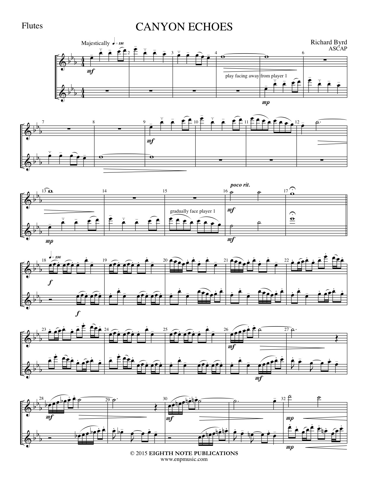 The musical material for Canyon Echoes was inspired after a trip to the Grand Canyon. The open voicings of quartal harmonies reflect the canyon s vast expanse. This work is fun to perform and enjoyable to hear, and is ideal for competitions, conference preludes and engaging concert programs.