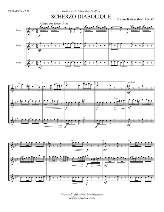 Scherzo Diabolique is a diabolical display of notes and rhythms designed to showcase the technical skills of the trio who performs it. It is a relentless foray into a facile-fingered fold. While initially sounding sinister, it takes on a light-hearted respite during the oasis that is the relative major. Not to be outdone, the diabolical nature returns with a vengeance to send this piece to its furious conclusion. The piece is dedicated to Mary Kay Godfrey, who provided the materials necessary to complete this composition.