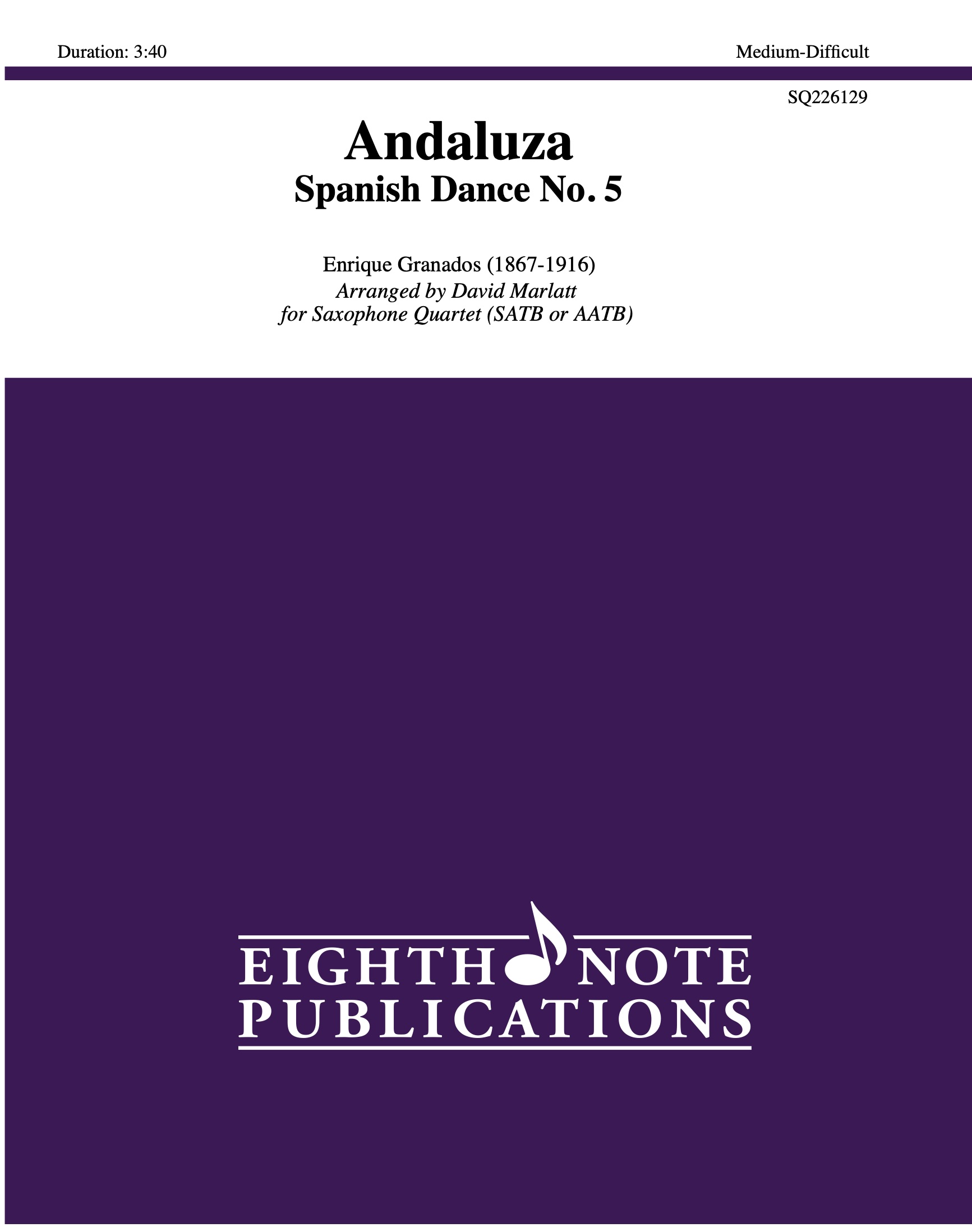 This Andaluza (or Playera) is part of a set of 12 Spanish Dances written in 1890. The color and harmonies lend themselves so well to the sonorities of the sax quartet. Ole!